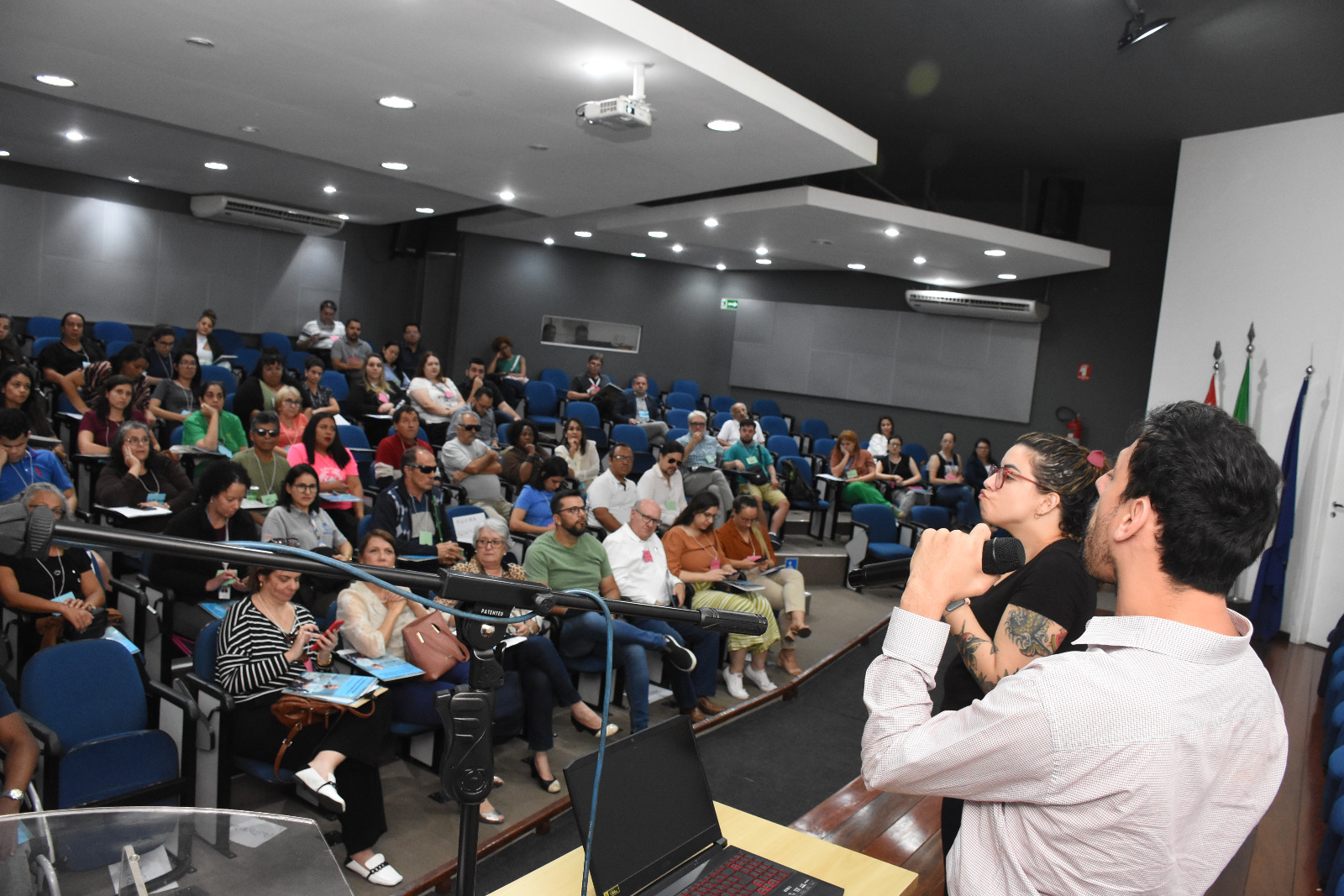 LEGENDA 2 E 3: Plenária da 4ª Conferência Municipal constituída presencialmente no Auditório “Bento Prado Jr.” durante a palestra do Prefeito Tiago do Zé Dito.