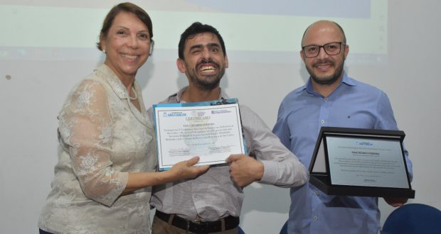 LEGENDA 1: Secretária Lucinha Garcia, Prefeito Tiago do Zé Dito (Campina de Monte Alegre/SP) e Secretário Mateus de Aquino (Secretaria Municipal de Relações Institucionais e Legislativas) no momento das homenagens.