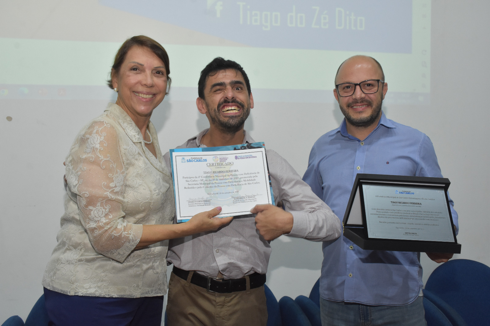 Desfeita a mesa de abertura, foi a vez do prefeito Tiago Ribeiro contar um pouco sobre sua experiência. Ferreira é conhecido como Tiago do Zé do Dito e é o único prefeito do Brasil com paralisia cerebral. Ele foi convidado pela secretária Lucinha Garcia a ser o principal palestrante da conferência. Na oportunidade, ele contou sua história de vida e falou de seu trabalho e gestão para tornar Campina de Monte Alegre um símbolo de acessibilidade às pessoas com deficiência. Ao final da palestra, o prefeito Tiago recebeu um certificado expedido pela SMPDMR e uma placa de mérito por sua visita ao município de São Carlos.