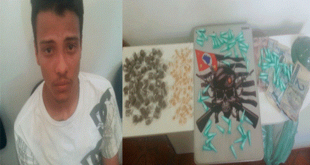 Segundo informações, o cabo Borges e soldado Matheus estavam em patrulhamento preventivo quando o suspeito saiu correndo e se escondeu em uma casa.  Os policiais o abordaram e localizaram  53 trouxinhas, 73 pinos de cocaína, 83 pedras de crack e a quantia de R$ 34,00