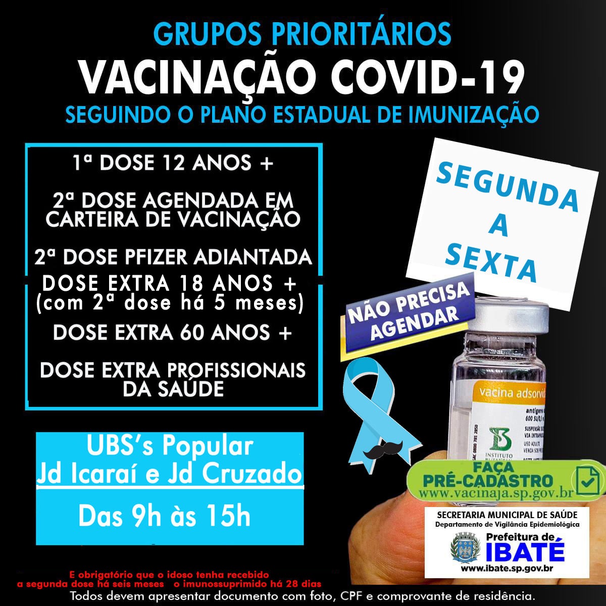 Seguindo orientação do Governo do Estado de São Paulo, a Secretaria Municipal de Saúde de Ibaté inicia nesta quinta-feira (18), a aplicação da 3ª dose contra a Covid-19, em pessoas maiores de 18 anos, que tomaram a 2ª dose há pelo menos cinco meses.