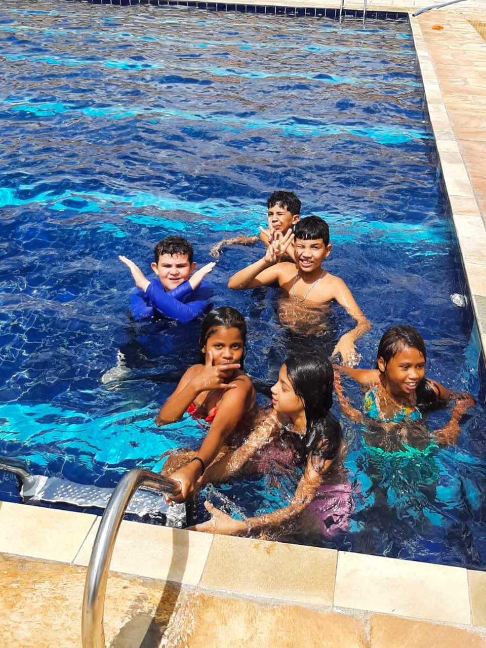 As crianças que frequentam diariamente o “Espaço Amigo”, participaram das atividades na Piscina Municipal com as educadoras do projeto, e do Campo Municipal, em parceria com a Secretaria de Esporte.