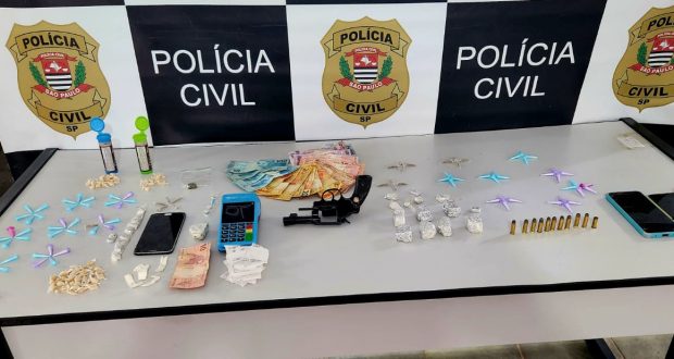 Nesta data (03/09/24), a Polícia Civil de São Paulo, através de equipes da D.I.S.E e contando com apoio de Policiais Civis do 1º/4º Distritos Policiais, durante atuação de campo especializada pelo bairro Jd. América em Ibaté/SP, efetuou a prisão em flagrante de dois indivíduos pela prática dos crimes de tráfico de drogas e posse ilegal de arma de fogo de uso restrito. Os agentes foram surpreendidos em uma espécie de “ferro velho”, sendo localizado, ao todo, 67 “ependorfs” contendo cocaína, 5 porções de “haxixe”, 4 comprimidos de “ecstasy”, 70 “pedras” de crack, 48 porções de “maconha”, 4 aparelhos celulares, uma máquina de cartão, R$754,00 em dinheiro e um revólver calibre 32 com numeração suprimida. Após serem autuados em flagrante na sede da Especializada, ambos foram recolhidos ao Centro de Triagem.