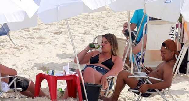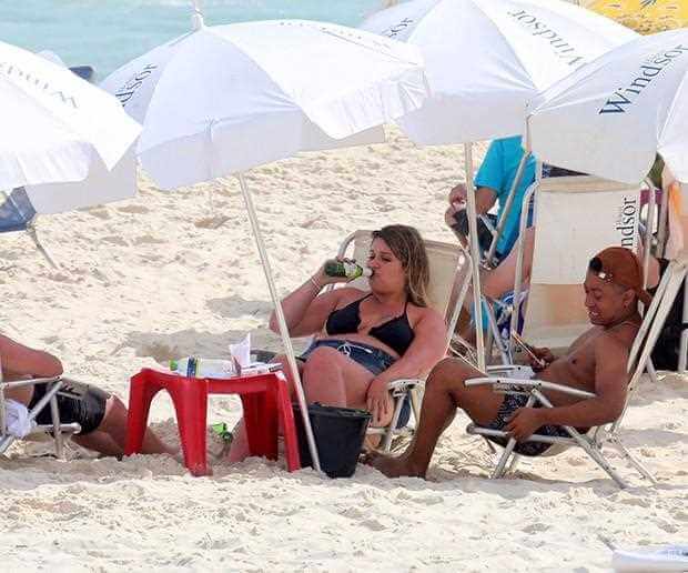 De biquíni e shortinho jeans, a cantora sertaneja foi fotografada com amigos. Ela se estirou em uma cadeira de praia e, claro, se refrescou com uma cervejinha.