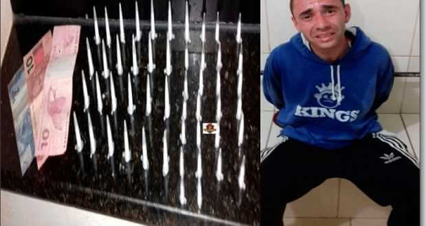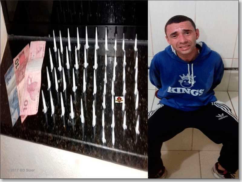 Segundo informações de boletim de ocorrência, após diversas ligações feitas para o 190, nas quais denunciantes relatavam que na referida rua estava ocorrendo tráfico de drogas. O sargento Adans, e os soldados Pascoalino e Quirino foram para o local e viram Gustavo. H. Pereira Silva, de 22 anos, tirando algo do bolso da blusa e jogando em uma matinha. Gustavo foi abordado e em revista pessoal foram localizados em seu poder R$ 22,00. O objeto dispensado, era um saco contendo cinquenta pinos de cocaína, sendo 25 pequenos e 25 grandes. O jovem foi encaminhado ao Plantão Policial, onde foi autuado em flagrante pelo delegado Dr. Caio Iberê Gobato e recolhido ao Centro de Triagem por tráfico de drogas.