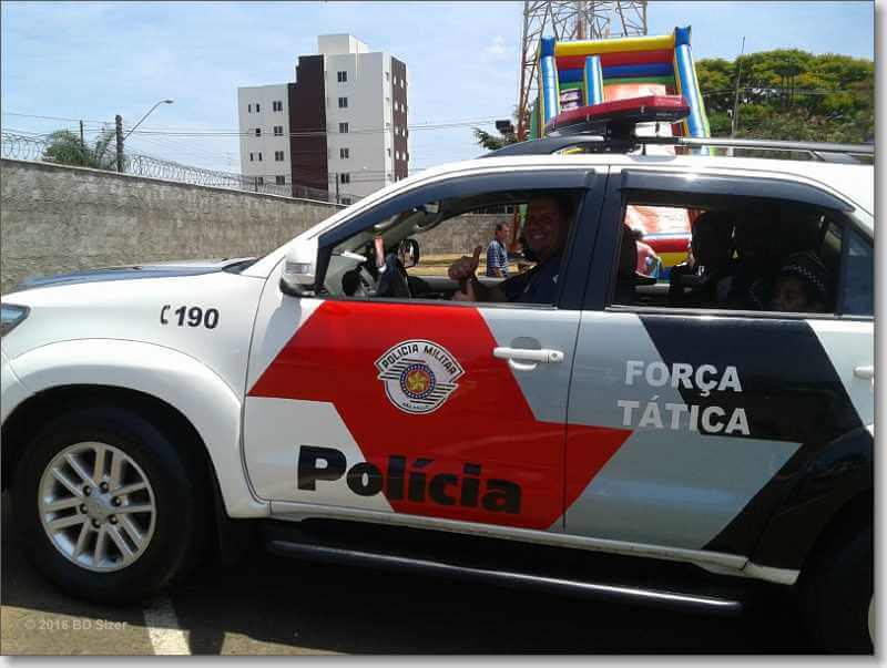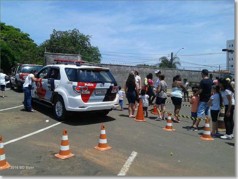 A Polícia Militar está realizando um festa para a criançada na Companhia da PM, situada na rua Santos Dumont, bairro Vila Marina, São Carlos-SP.