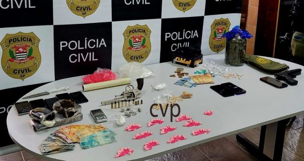 Na presente data (01/06/2023), com apoio de demais Policiais Civis desta cidade e também da Guarda Municipal de São Carlos, foram deflagrados os cumprimentos dos mandados de busca e apreensão nas residências alvos das investigações, sendo localizados: R$800,45, 89 porções de “crack”, 115 “ependorfs” contendo cocaína, 115 porções de “maconha”, uma “pedra” de “crack” em estado bruto, 4 “meio tijolos” de “maconha” (1,323g), um simulacro de arma de fogo do tipo pistola, 227 gramas de “maconha in natura”; uma arma de fogo do tipo revólver, calibre 38, munições dos calibres .38, .380 e .32, diversos apetrechos utilizados no tráfico de drogas (plástico filme, embalagens plásticas, balança de precisão e ependorfs vazios) e diversos aparelhos celulares.