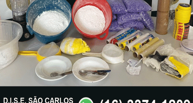 Durante diligências policiais na área rural desta cidade, as equipes localizaram e apreenderam em uma residência duas bacias contendo substância branca análoga à cocaína a granel, eletrodomésticos e demais apetrechos comumente utilizados no tráfico de drogas, tais quais: um liquidificador, duas peneiras, dois pratos, três talheres, quatro embalagens plásticas vazias as quais aparentavam terem servido de embalagem para tijolos de cocaína, uma delas envolta em papel carbono, a fim de burlar eventual raio-x, uma balança de precisão, um rolo grande de plástico filme, quatro rolos menores de plástico filme, quatro rolos de sacos plásticos, treze fitas adesivas cor amarela, sete mil eppendorfs vazios cor coxa, disponibilizados em sacos fechados de 1000 unidades cada, dois pedaços de papel contendo manuscritos indicativos da contabilidade do tráfico de drogas, uma outra bacia plástica com resquícios de cocaína e um invólucro plástico contendo substância branca em pó, com a inscrição à mão “secante” em seu exterior. Ao final, restou aferida a quantia de 2,5kg de cocaína a granel. O indivíduo detido foi recolhido ao Centro de Triagem de São Carlos para regular responsabilização criminal*. As investigações prosseguem.