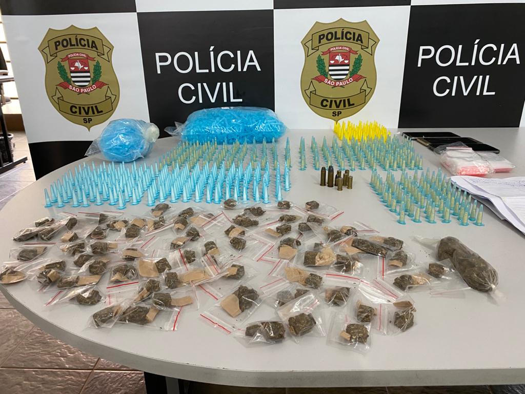 No transcorrer desta semana, durante Atuação de Campo de Polícia Judiciária contra o tráfico de drogas na região de São Carlos-SP, a POLICIA CIVIL, por meio de equipes da DISE, com apoio de Policiais Civis desta Delegacia Seccional, sob o comando do Delegado de Polícia Dr. Miguel Carlos Capobianco Jr., cumpriram diversos mandados de busca e apreensão, os quais resultaram na prisão de três indivíduos pela prática dos crimes de tráfico de drogas e associação para o tráfico de drogas. As equipes policiais localizaram e apreenderam, ao todo: R$2124,00, 201 porções individualizadas de “maconha”, três tijolos de maconha, 48 espécimes vegetais de Cannabis Sativa L., totalizando 12.435kg desta droga, 570 microtubos contendo cocaína, 6 munições calibre 32, 3 munições calibre 38, 1100 microtubos para acondicionamento de cocaína, além de contabilidade do tráfico de drogas e objetos comumente utilizados para a prática deste crime. Diante dos fatos os indiciados foram autuados em flagrante delito e recolhidos ao Centro de Triagem de São Carlos/SP à disposição da Justiça Pública. As investigações prosseguem.