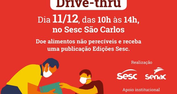 Neste sábado (11/12), das 10h às 14h, em frente ao Sesc São Carlos, localizado na avenida Comendador Alfredo Maffei, 700, acontece o DRIVE-THRU – AÇÃO URGENTE CONTRA FOME, evento realizado pelo Sesc e Senac, com apoio da Prefeitura de São Carlos, Sincomercio e EPTV.