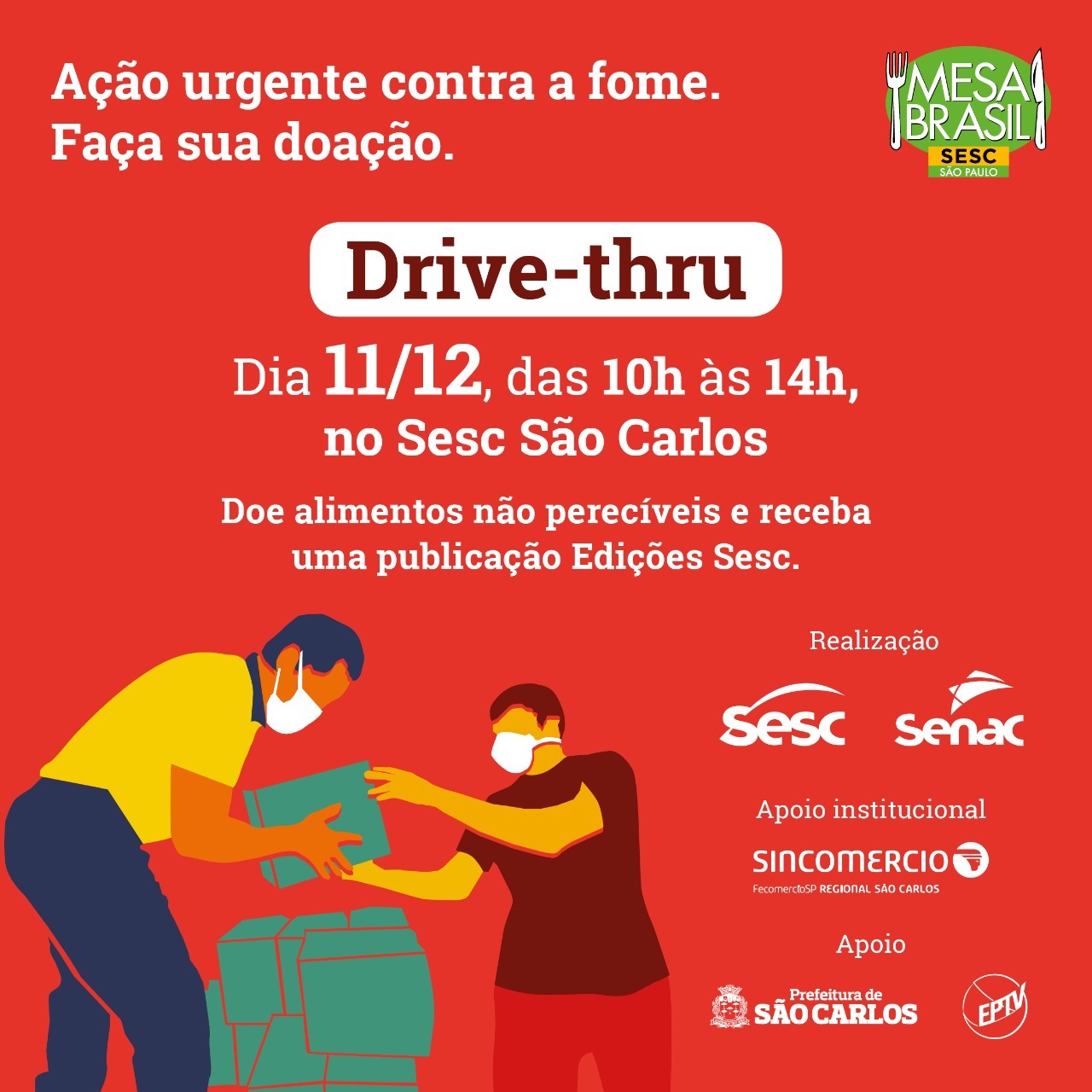 Neste sábado (11/12), das 10h às 14h, em frente ao Sesc São Carlos, localizado na avenida Comendador Alfredo Maffei, 700, acontece o DRIVE-THRU – AÇÃO URGENTE CONTRA FOME, evento realizado pelo Sesc e Senac, com apoio da Prefeitura de São Carlos, Sincomercio e EPTV.