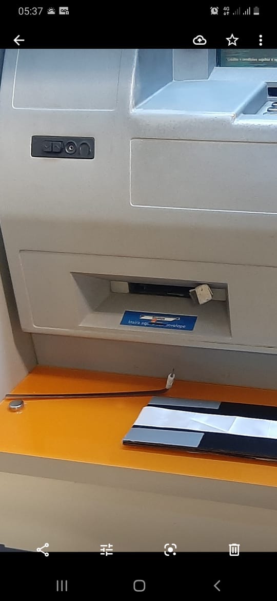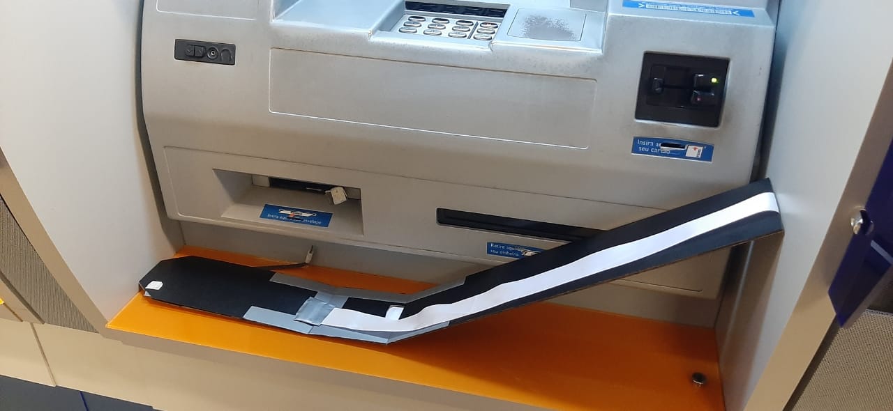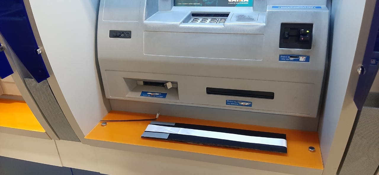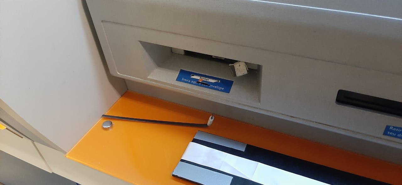 Localizado com ambos um aparelho para retirada de envelopes dos caixas eletrônicos, inclusive um dos caixas já estava com uma ferramenta travando a entrada dos envelopes.