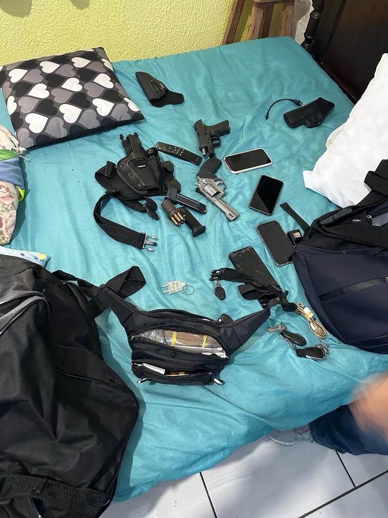 Ainda no imóvel, foram apreendidas três armas de fogo sendo um revólver calibre 357, uma pistola Colt calibre 45 e uma pistola Taurus calibre 380, além de capas de coletes balísticos, mais de 20 quilos de pasta base e apetrechos para a produção de entorpecentes.