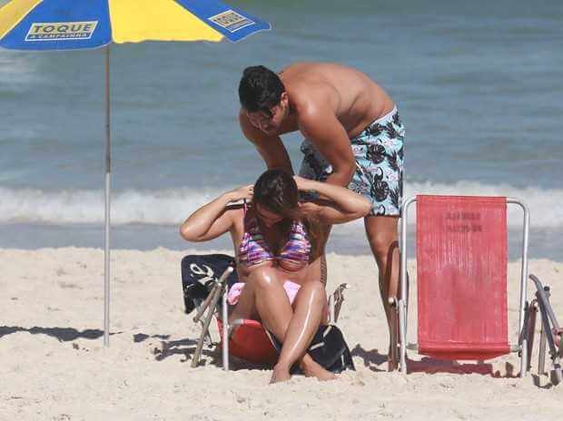 Nicole Bahls renovou o bronze na praia da Barra da Tijuca, no Rio de Janeiro. A morena contou com a ajuda do noivo Marcelo Bimbi para dar uma ajeitadinha no biquíni e quase mostrou demais.