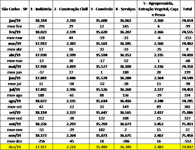 São Carlos. O número de empregados formais da cidade atingiu 74.897 postos no mês de dezembro de 2019. O saldo líquido de criação de postos ao longo do ano foi de 243, apesar de ter ocorrido redução de 553 postos no mês de dezembro. São Carlos acompanhou as evidências do Brasil com relação ao mês de dezembro.