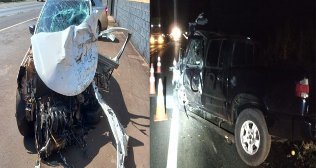 No local do acidente, os policiais militares rodoviários foram informados, que R.W.G.N, conduzia o Gol, que teria adentrado a pista contrária e colidido com a caminhonete S-10, que seguia na direção contrária, tendo a feminina, V. P. P, ao volante.