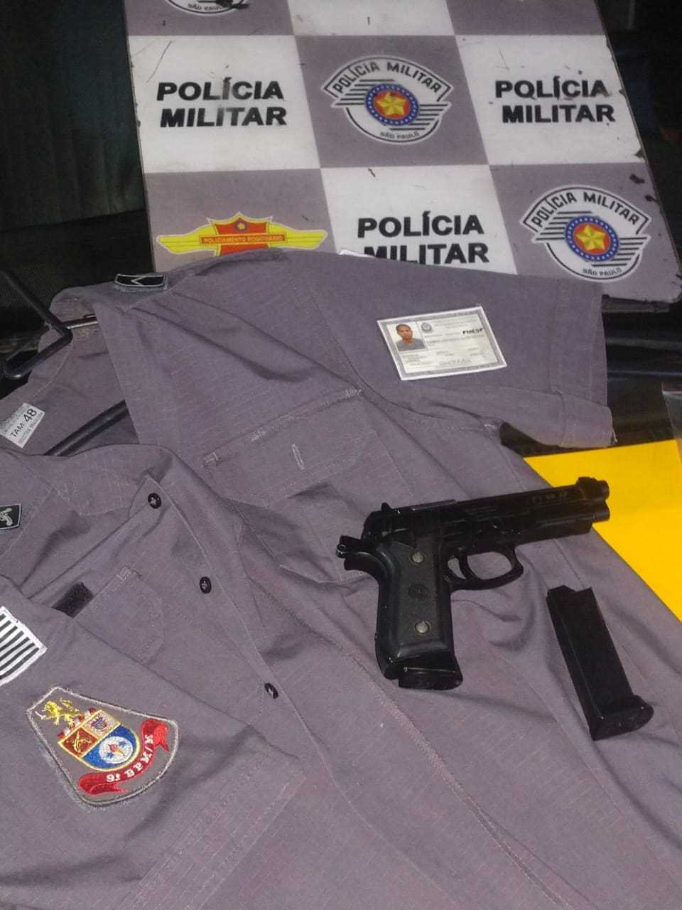 Segundo informações, o sujeito aparentava que poderia tirar a própria vida em uma passarela da Rodovia Washington Luís . Policiais foram para o local e tomaram ciência que o mesmo dizia que era PM. Os policiais foram até sua casa no bairro Douradinho e encontraram uma gandola, munições e também uma arma falsa. O averiguado foi encaminhado ao Plantão Policial, autuado em flagrante por posse irregular de arma de fogo , ficando à disposição da justiça.