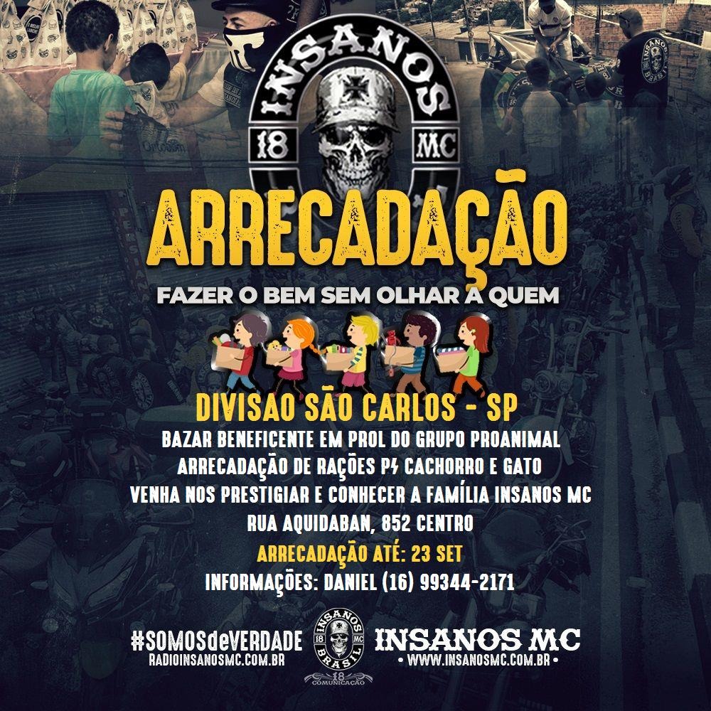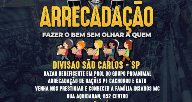 Um evento beneficente será realizado pela galera do Insanos MC Motoclub no próximo sábado, 23, na Rua Aquidaban, Nº 852, no Centro de São Carlos.