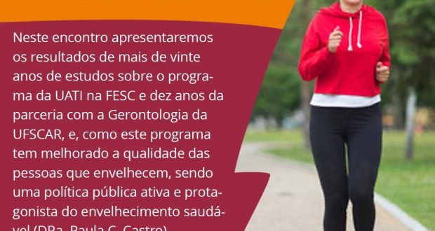 Neste encontro apresentaremos os resultados de mais de vinte anos de estudos sobre o programa da UATI e dez anos da parceria com a Gerontologia da UFSCAR, e, como este programa da FESC tem melhorado a qualidade de vida das pessoas que envelhecem sendo uma política pública ativa e protagonista na promoção do envelhecimento saudável.