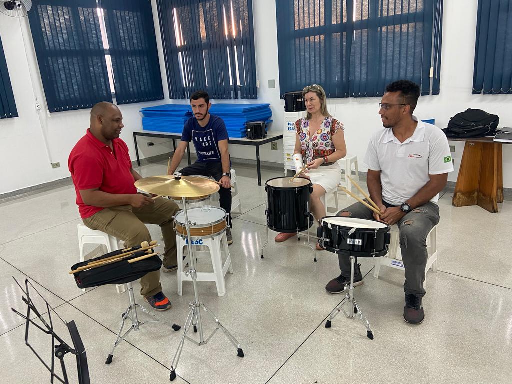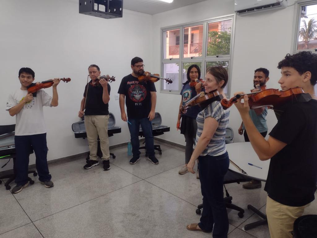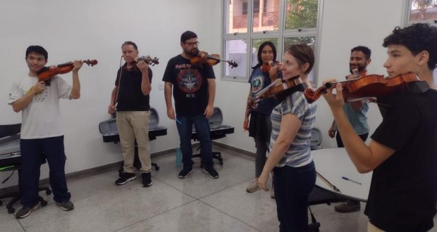 Já na primeira aula os alunos tiveram contato com os instrumentos de cordas como violoncelo, viola clássica, contrabaixo e instrumentos de percussão.