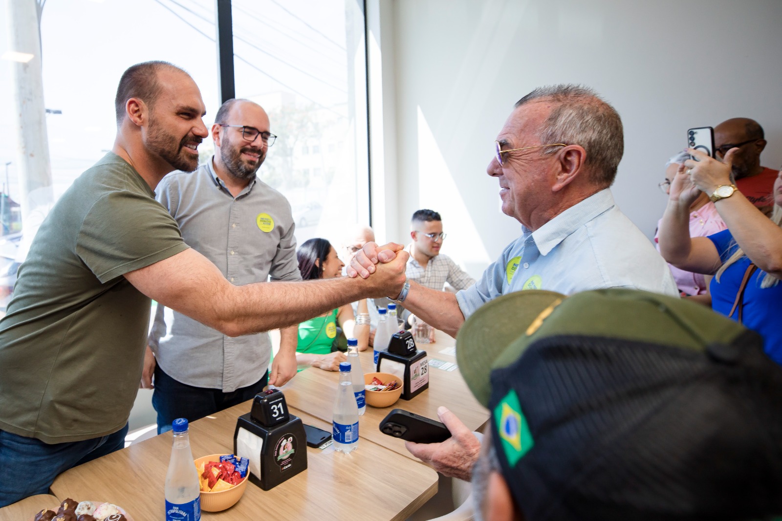 O candidato a prefeito Netto Donato (PP) recebeu, mais uma vez, a visita do deputado federal Eduardo Bolsonaro (PL) em São Carlos. O encontro ocorreu no final da manhã desta terça-feira (20/08) em uma padaria no Jardim Ipanema, mostrando novamente a força que a campanha de Netto vem tomando e a consolidação do apoio de relevantes forças políticas nacionais em torno de sua candidatura à Prefeitura da cidade.