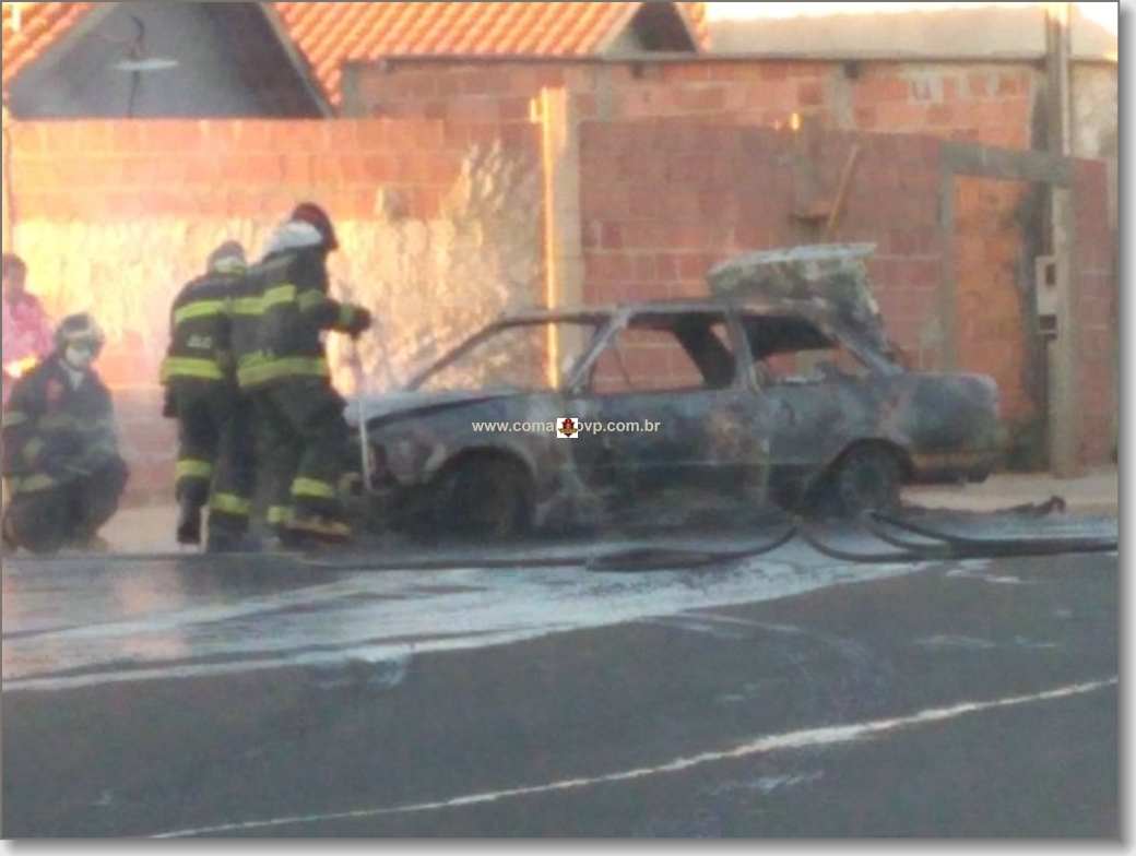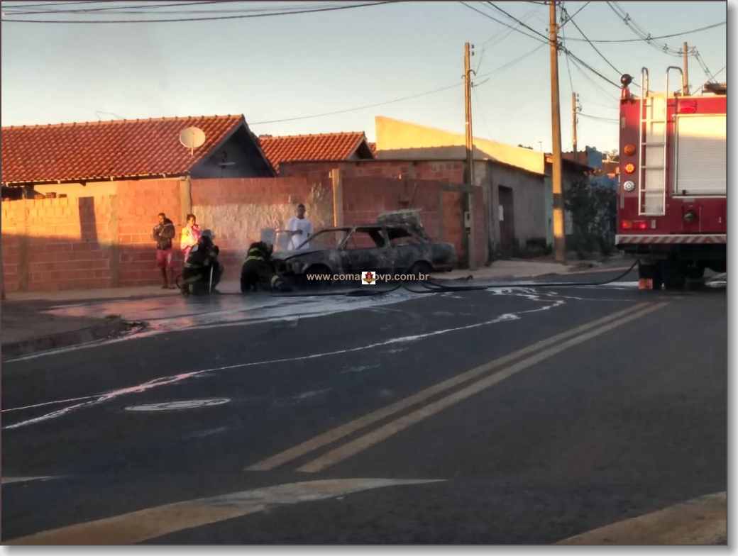 Um veículo Monza ficou destruído nesta manhã de domingo por um incêndio no bairro Jd. Zavaglia, São Carlos-SP.