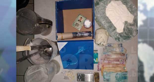 Foram encontradas 16 pedras de crack, 1766 reais, 26 munições, cocaína a granel e materiais para embalo e preparo da droga.