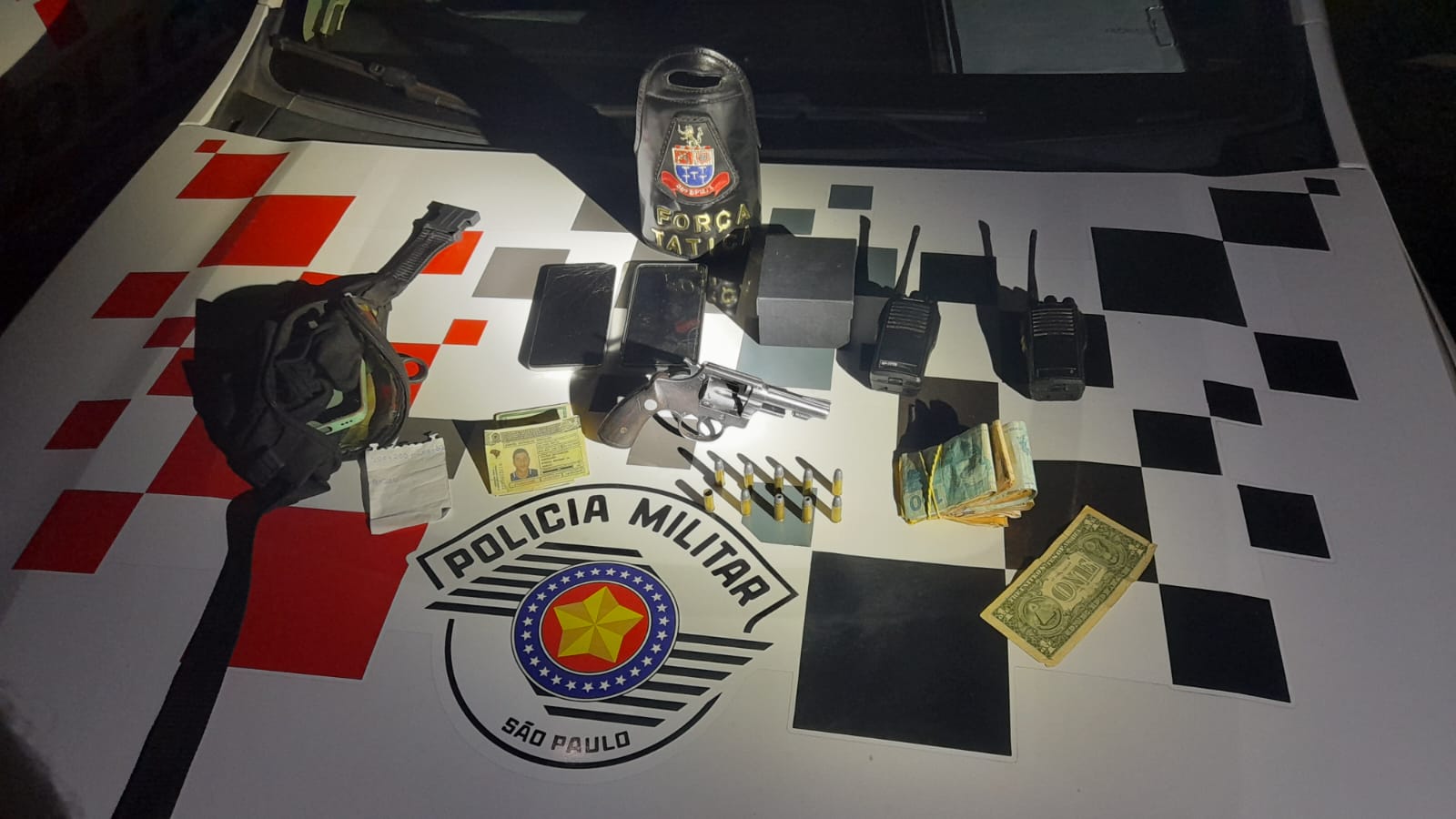 De acordo com informações, uma viatura da Força Tática, composta pelo sargento Wanderson, cabos Osmar, Neto e soldado Ederson, estava em patrulhamento, momento que um sujeito em uma moto empreendeu fuga, mas foi acompanhado e abordado na garagem da casa dele na Rua Antônio Borelli Thomaz. Com o averiguado foi localizado um rádio HT, usado somente para comunicação entre traficantes, celular, elásticos ( usados em dinheiro) e anotações de tráfico. Os policiais conversaram com G.Q.G, de 24 anos, e ele confessou que guardava uma arma de fogo dentro do seu quarto. A entrada na casa foi franqueada pela avó do averiguado e o revólver calibre 32, com 9 munições intactas e uma deflagrada foi apreendido. Foram apreendidos também R$ 1.480,00 e U$$ 1,00. A ocorrência foi encaminhada para a Delegacia de Polícia Civil, onde o detido foi autuado em flagrante por posse ilegal de arma de fogo, mas colocado em liberdade após pagar fiança no valor de mil e quinhentos reais.