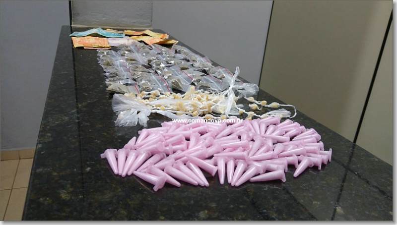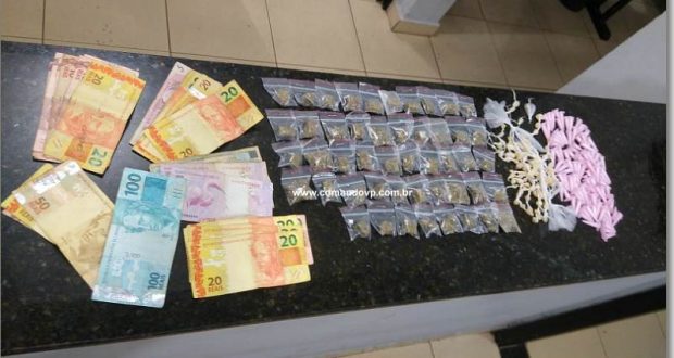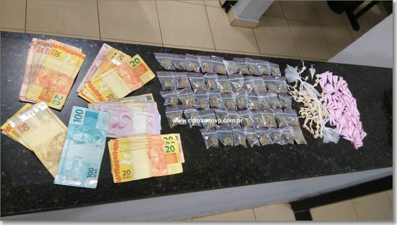 De acordo com informações, policiais militares da Força Tática estavam em patrulhamento preventivo, quando avistaram dois indivíduos em atitude suspeita. Ambos foram abordados e apreendidos 48 porções de maconha , 105 pedras crack, 104 pinos cocaína e R$ 521,00. O menor de 15 anos disse que devido dificuldade financeira, estaria vendendo drogas e o maior seria usuário. A PM verificou que o adolescente estava com Mandado de Busca e apreensão. A dupla foi encaminhada para a Central de Polícia Judiciária, onde ficou à disposição da justiça.
