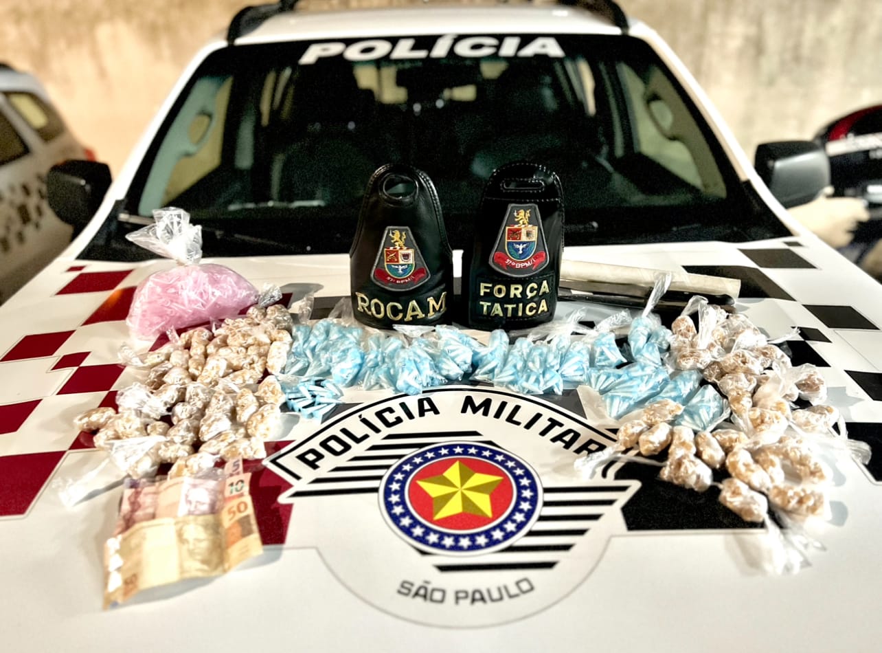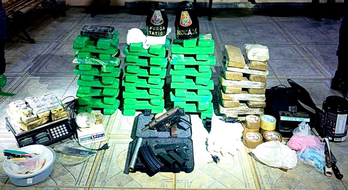 De acordo com informações, os indivíduos estavam em um carro. Dois foram detidos e um conseguiu fugir.  Durante as buscas, foram encontrados 107 tijolos de maconha, 3 tijolos de pasta base de cocaína, 19 pedaços de haxixe, 13 embalagens de cocaína, uma submetralhadora calibre 9mm, um supressor de ruídos, um carregador de fuzil calibre 556, além de diversos apetrechos para embalo e preparo das drogas. Na residência vizinha, foram localizadas 1.157 pedras de crack e 374 eppendorfs de cocaína.  Os abordados foram encaminhados para a Delegacia da Polícia Civil, onde ficaram à disposição da justiça.