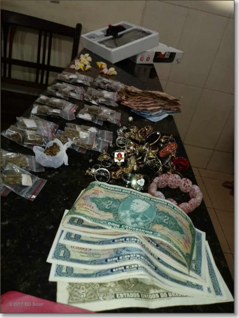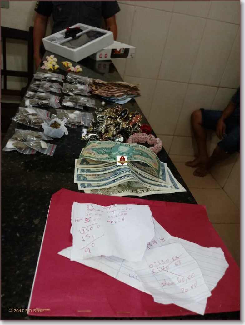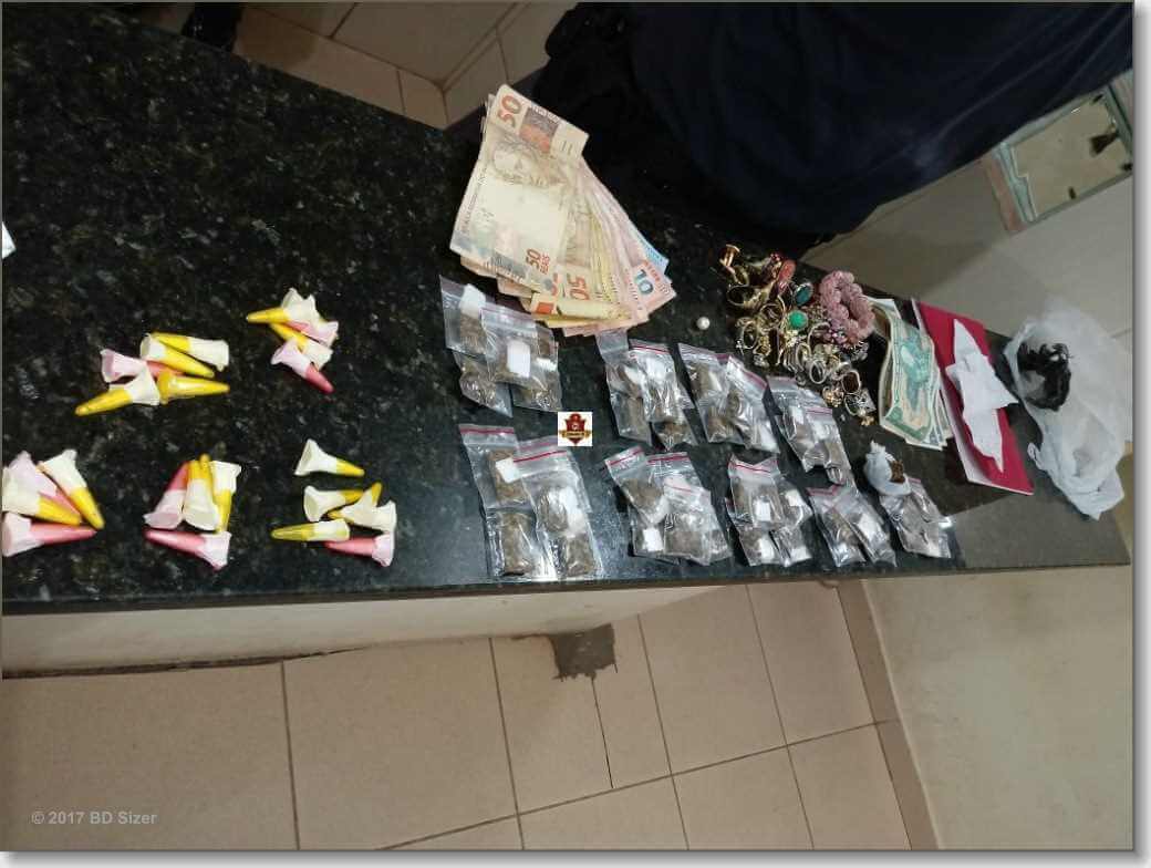 O fato aconteceu por volta das 18:10. Segundo informações, a equipe da Força Tática, composta pelo sargento Strozze, cabo Tiago e soldado Pereira abordou o adolescente saindo de uma residência e em seu poder foram localizados 26 pinos cocaína. Ao averiguar o interior da casa maior, o maior identificado como Kevin .B. Veríssimo. Carachester foi flagrado contando e 45 porções de maconha. O maior de idade negou qualquer envolvimento com o crime e disse que estava penas na casa do amigo.