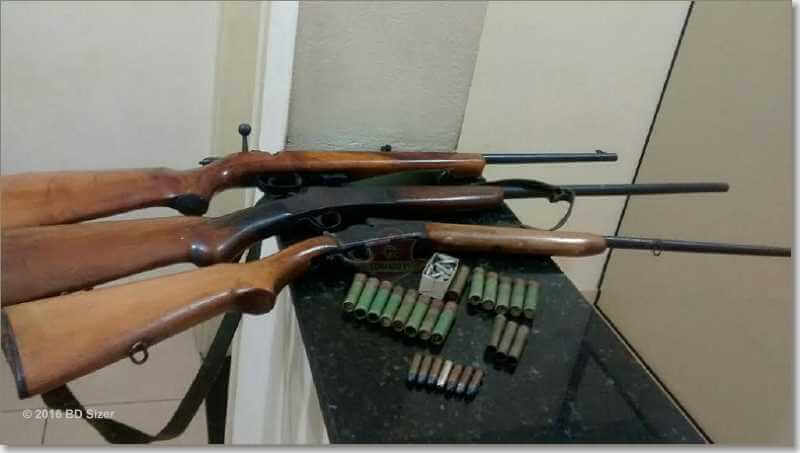 Segundo boletim de ocorrência, por volta das 18:00, o Centro de Operações da Polícia Militar recebeu denúncia que em uma casa situada no referido local havia armas de fogo. Uma equipe da Força Tática foi para o local e em contato com o morador da residência o mesmo confessou que guardava três espingardas e munições. As armas foram entregues aos policiais o averiguado encaminhado ao Plantão Policial. Após o delegado tomar ciência dos fatos autuou o detido em flagrante e o liberou após pagamento de fiança no valor de R$ 880,00. Todas as armas estavam com numeração intacta e segundo informações, são de herança e já têm mais de 30 anos.