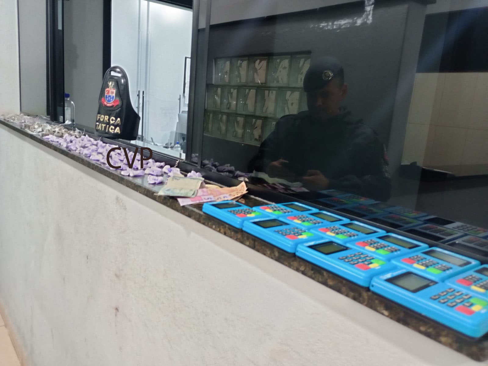 De acordo com informações, os policiais, sargento Caon, cabos Vinicius e Moreira estavam em patrulhamento preventivo, momento que abordaram o menor. Com ele foram 4 porções de maconha. Em um terreno baldio, os policiais localizaram mais 10 máquinas de cartão, 82 porções de maconha, R$ 149,00 e 179 pinos de cocaína. A ocorrência foi encaminhada para a Central de Polícia Judiciária, onde o menor ficou à disposição da família.
