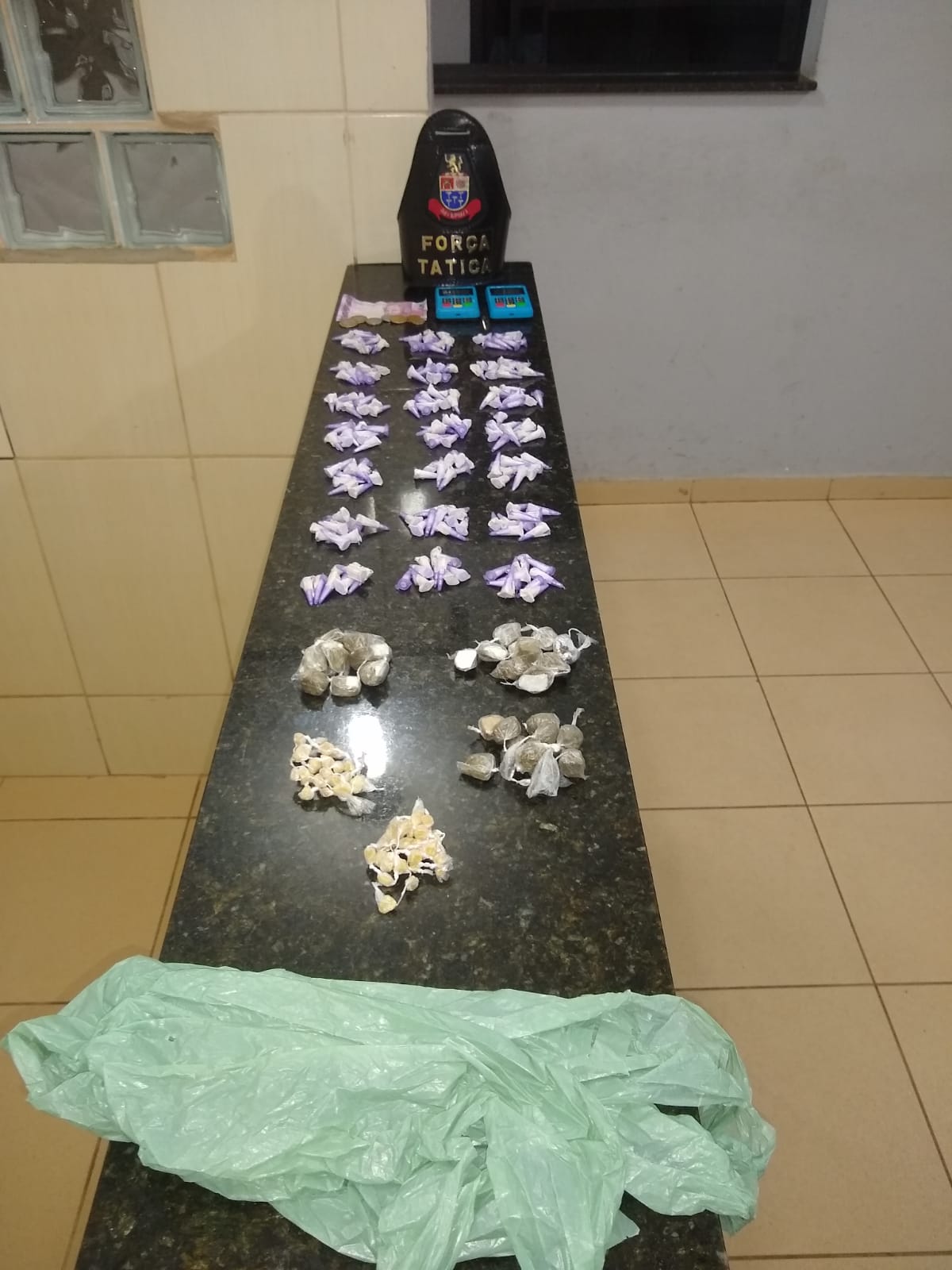 Ambos foram abordados e em busca pessoal foram localizados em poder de Erik R$ 7,20 centavos, 9 porções de cocaína, 24 pedras de crack e 12 porções de maconha que estavam em sua mãos.