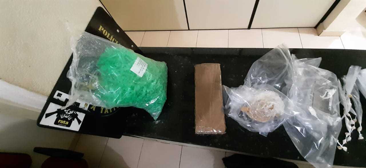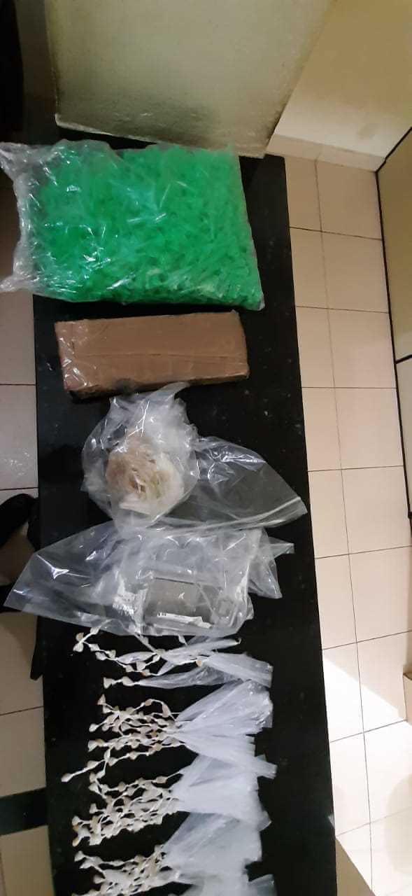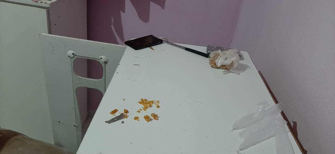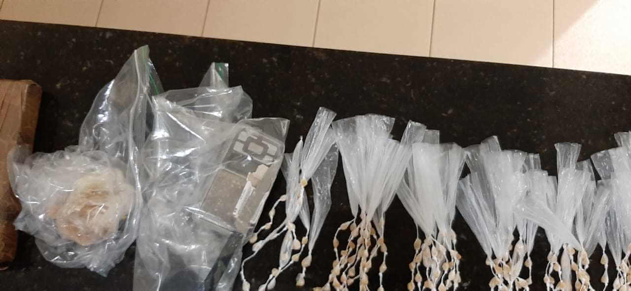 No local foram localizadas 376 pedras de crack, 01 pedra bruta da mesma droga, 01 tijolo de maconha, aproximadamente 1000 pinos vazios, além de balança e apetrechos para embalo e preparo da droga.