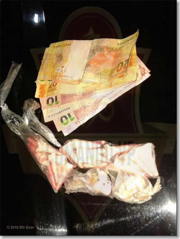 Segundo o tenente Rocha, Bruno foi detido após o Centro de Operações da Polícia Militar (COPOM) receber uma denúncia de trafico de drogas, onde o denunciante passou todas as características do suposto traficante. O tenente Rocha, cabo Jader e soldado Frisene se deslocaram até o local indicado pelo denunciante, onde encontraram Bruno abaixado e com o mesmo foram localizados 13 pedras de crack,21 pinos de cocaína e R$ 95,00. Bruno que quando menor foi detido várias vezes, foi encaminhado ao Plantão Policial, ficando à disposição do delegado de plantão.