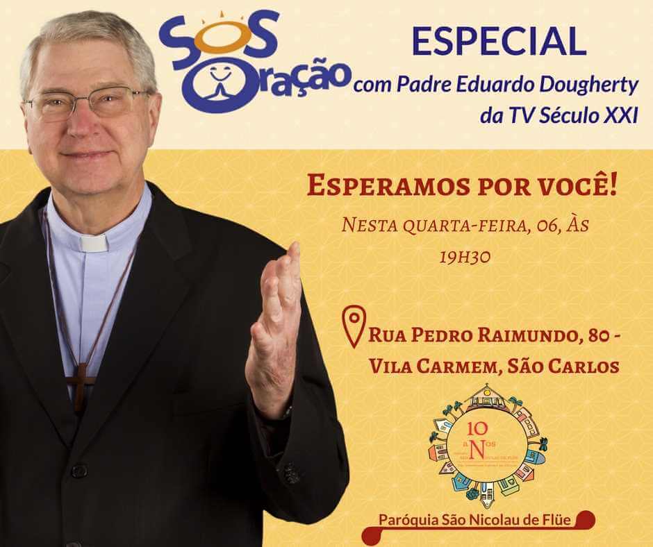 O jesuíta americano que trouxe o movimento de Renovação Carismática Católica (RCC) ao Brasil, Padre Eduardo Dougherty, estará conduzindo amanhã o SOS Oração na Paróquia de São Nicolau de Flüe, na Vila Carmem.