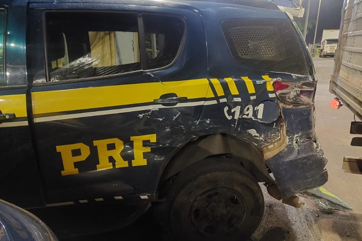 Sem controle, o veículo passou sobre um quebra-molas e colidiu com viaturas da PRF que estavam estacionadas na área externa da unidade.