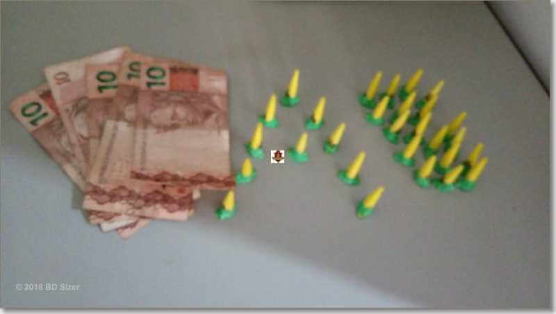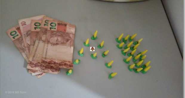 Segundo informações, o cabo Osmar e soldado J-Soares estavam em patrulhamento preventivo quando se depararam com os menores, de 11 e 17 anos. Eles saíram correndo, mas foram detidos . Foram localizados 28 pinos de cocaína e R$ 50,00 no tronco de um pé de manga. Os adolescentes foram encaminhados à Delegacia de Investigações Sobre Entorpecentes (DISE), ficando à disposição da autoridade policial. O menor de 11 anos disse que a droga era dele. O outro disse que estava no local fumando maconha. O menor disse também que no ano passado assaltou uma pessoa no bairro Cidade Jardim. Ele disse que usou uma réplica de arma de fogo para praticar o roubo.