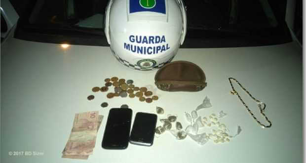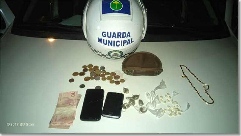 No total foram apreendidos R$ 35,00 em notas fracionadas, R$ 8,90 em moedas, 07 porção de maconha, 12 pinos de cocaína, 26 pedra de crack, 01 corrente dourada, 01 celular da marca Motorola e 01 celular LG.