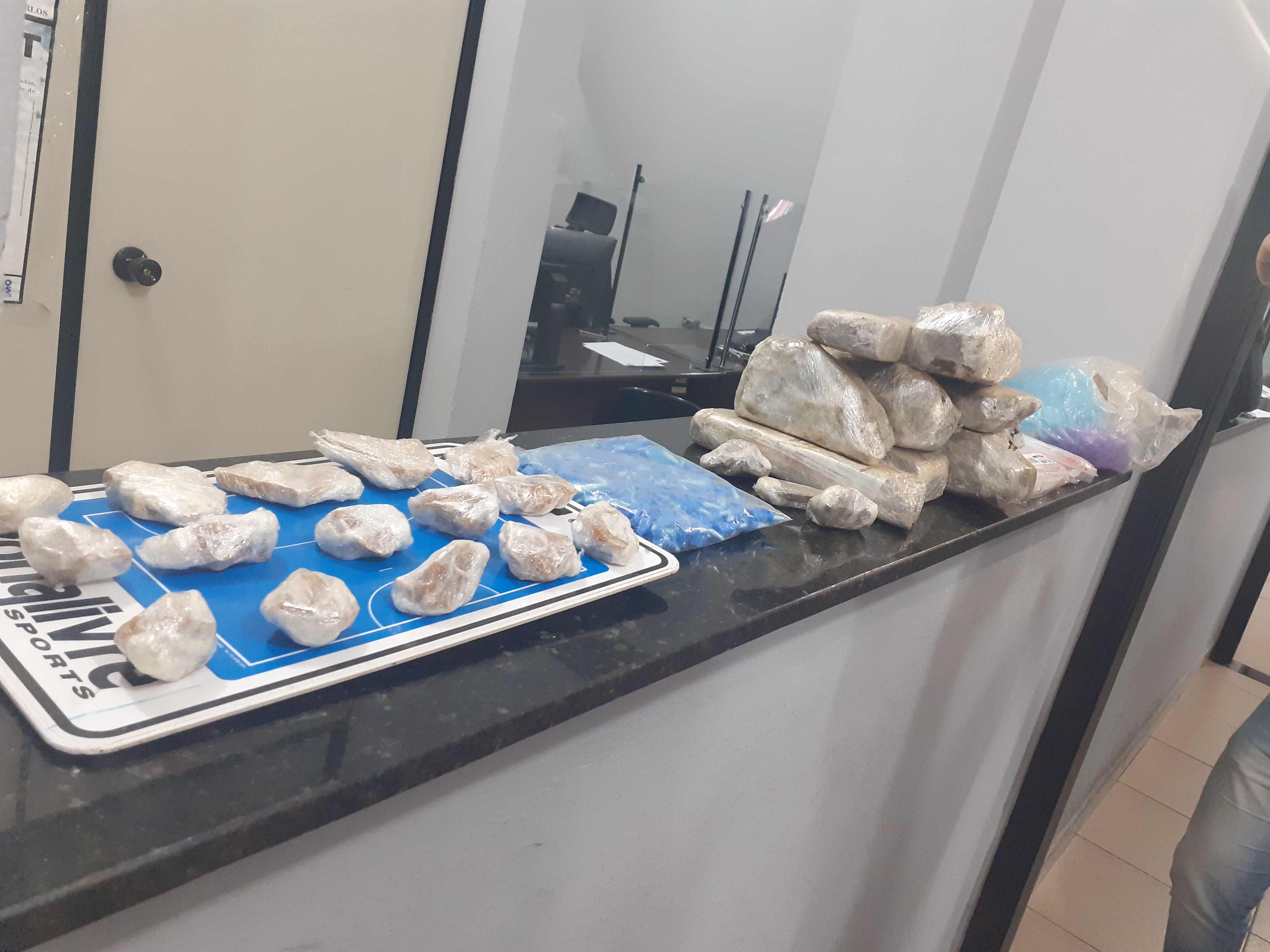 Foram apreendidos 212 pinos de cocaína, 15 porções de crack , 9 tijolos de maconha, 1700 embalagens para embalar drogas e 500 pinos vazios. As drogas foram encaminhadas à Central de Flagrantes, onde serâo apreendidas.