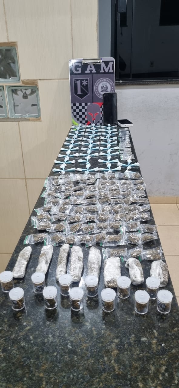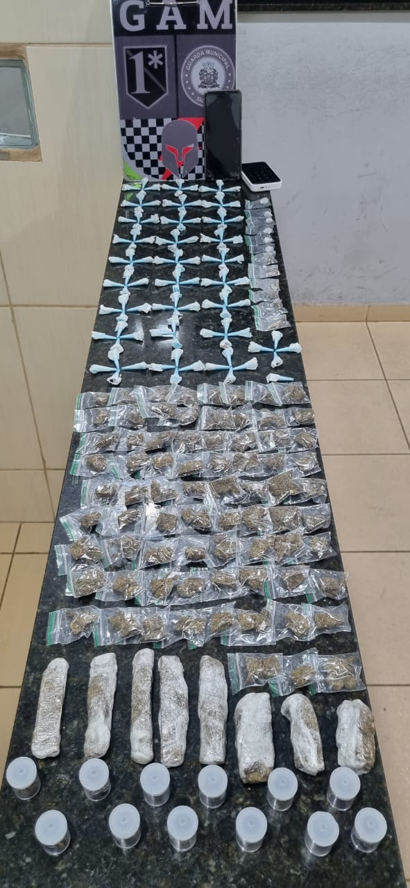 Em um terreno baldio foram localizadas drogas. No total foram localizados 112 pinos de cocaína, 6 flor de maconha, 6 porções de haxixe , 12 skank , 8 tablete de maconha e 75 trouxinhas de maconha. A ocorrência foi encaminhada para a Central de Polícia Judiciária, onde as drogas foram apreendidas e os averiguados liberados.