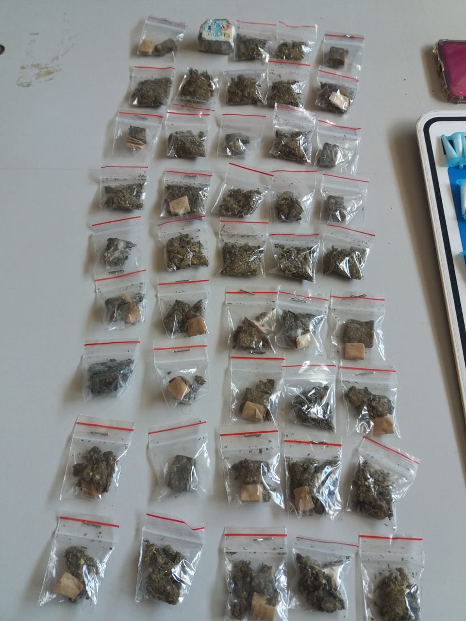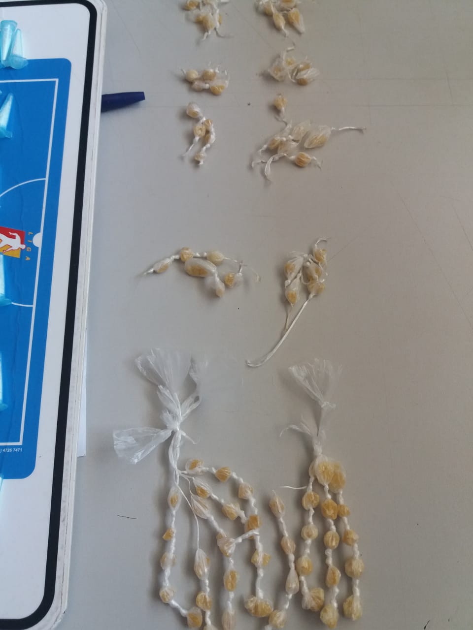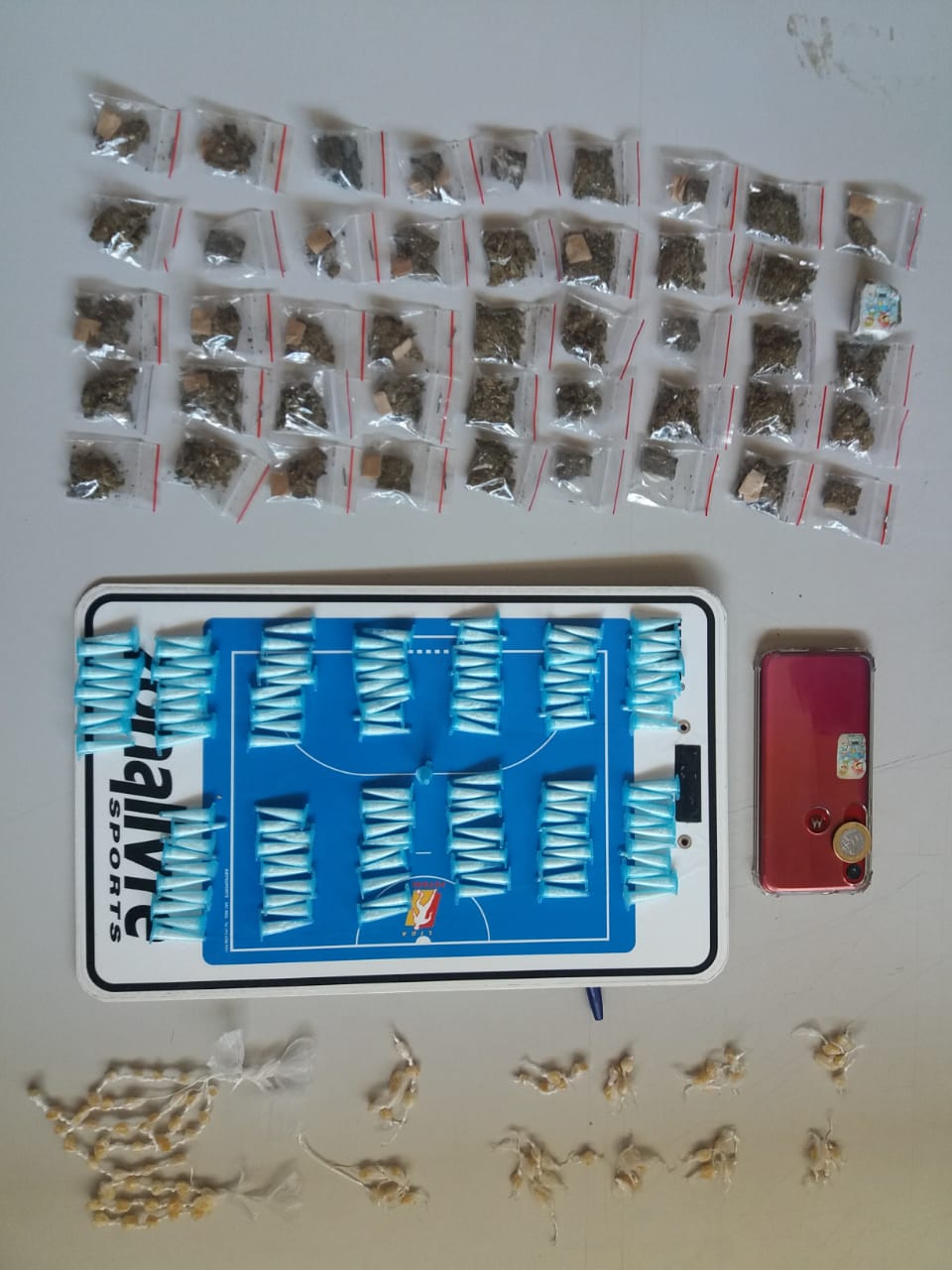 De acordo com informações, uma equipe estava em patrulhamento preventivo quando avistou um menor contando algo no condomínio Dois. O jovem saiu em desabalada carreira e deixou para trás 45 porções , 95 porções , 131 pinos e 01 celular. O menor não foi detido. As drogas foram encaminhadas à DSIE e apreendidas.