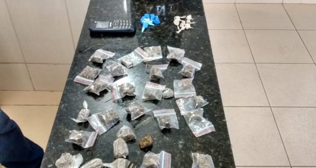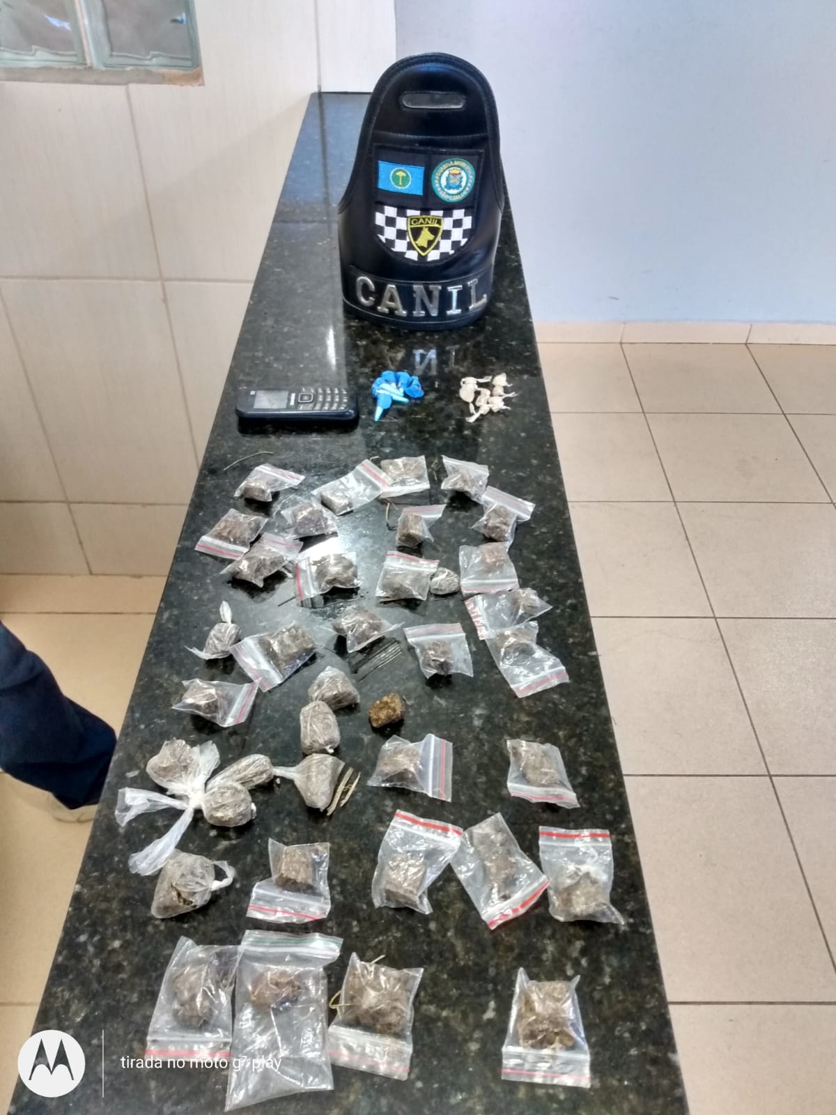 Segundo informações, a equipe do Canil estava em patrulhamento preventivo pela praça Sérgio Luiz Rocha , local conhecido como ponto de venda de entorpecentes, quando foi abordada uma mulher. Com a mesma nada de ilícito foi localizado. Foi acionado o K9 Murphy que logrou êxito em localizar uma sacola cor preta sob um monte de mato seco com 04 epeendorfs substância análoga a cocaína , 39 porções substância análoga a maconha ,10 pedras substância análoga ao crack e 01 celular marca Samsung. Sendo assim as substâncias análogas a entorpecente e o celular foram apresentados na Central de Flagrantes e aprendidas.