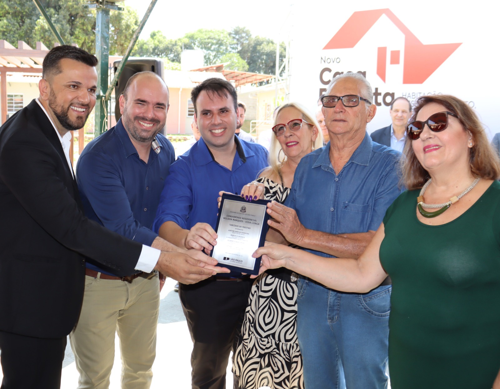 O secretário de Estado de Desenvolvimento Social, Gilberto Nascimento e o diretor de Obras da CDHU, Silvio Vasconcellos, acompanhados dos secretários de Governo, Netto Donato, no ato representando o prefeito Airton Garcia e de Cidadania e Assistência Social, Rodolfo Hernane, além do vereador Gustavo Pozzi, representando o presidente da Câmara Municipal, Marquinho Amaral e do Bispo Dom Luiz Carlos Dias, inauguraram na manhã desta sexta-feira (22/09), o primeiro condomínio república para idosos denominado “Residencial “Wilson Marques”, construído por meio do programa ‘Vida Longa’.