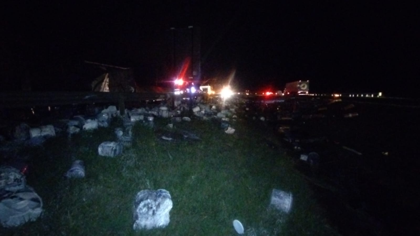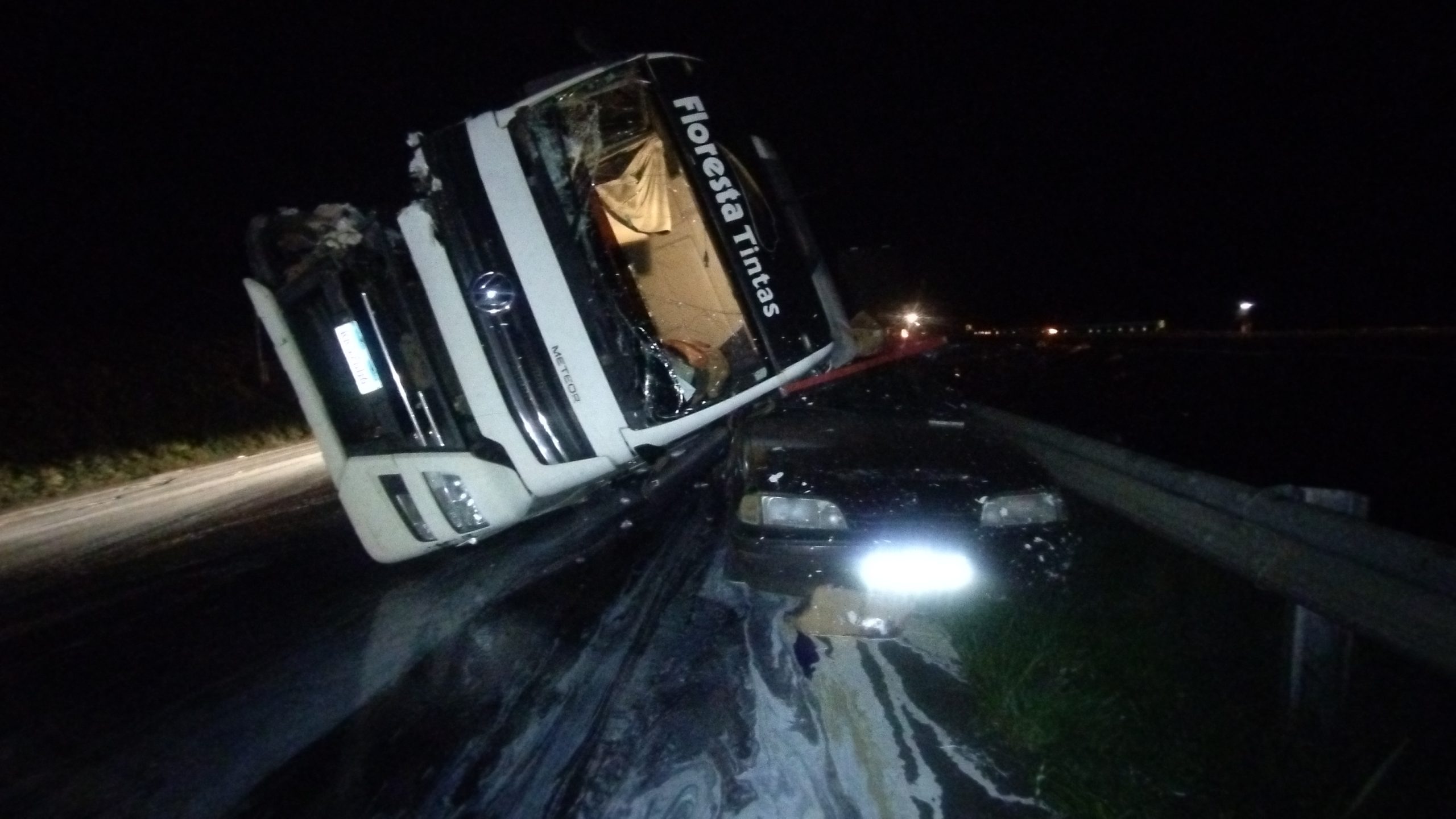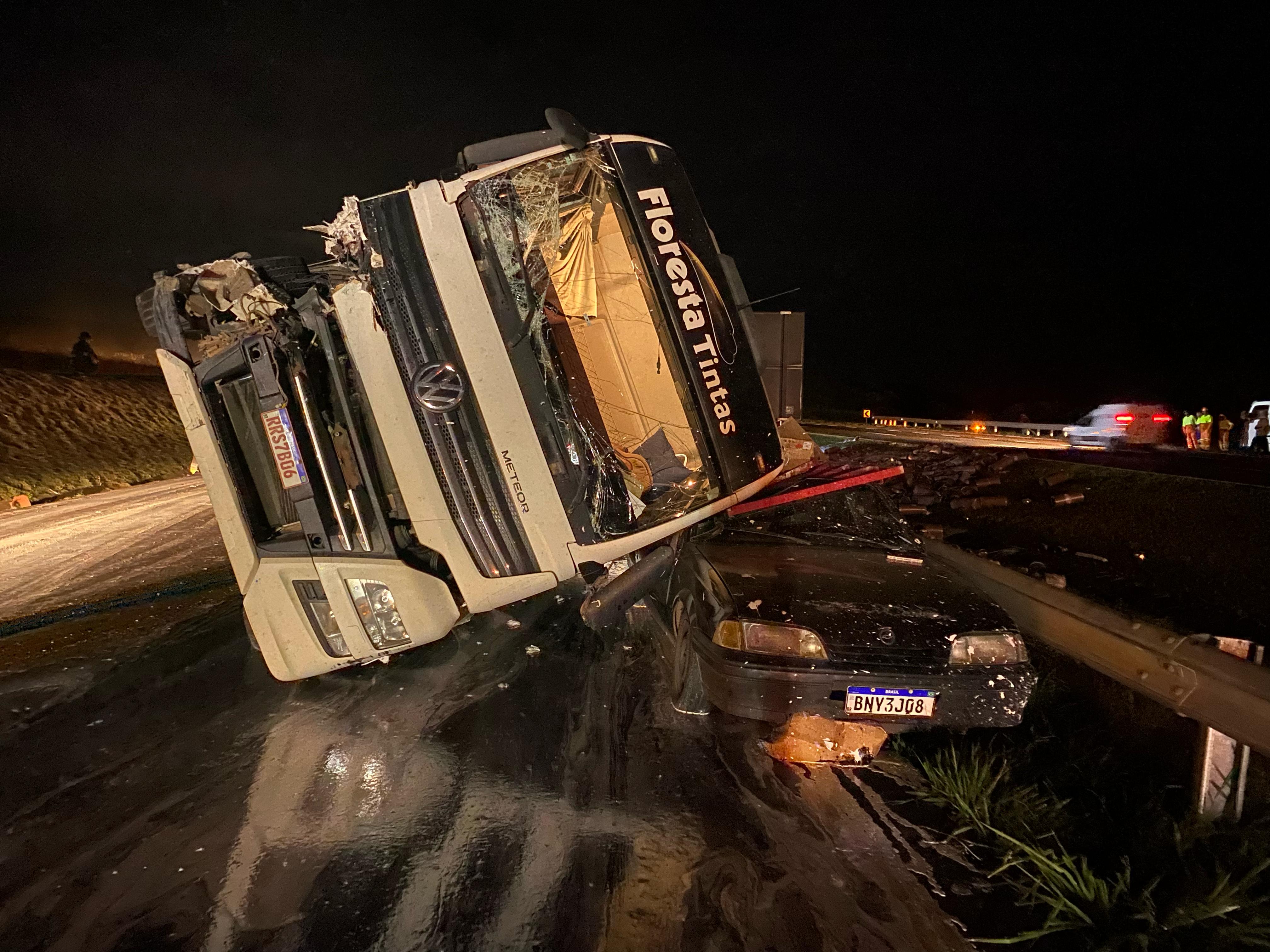 De acordo com informações apuradas pelo Portal Morada no local, um caminhão branco, carregado com tintas, foi fechado por outro caminhão. Para evitar a colisão, o motorista desviou para o acostamento, momento em que atingiu a traseira de um guincho que seguia à sua frente. Com o impacto, o caminhão tombou sobre um Chevrolet Monza.