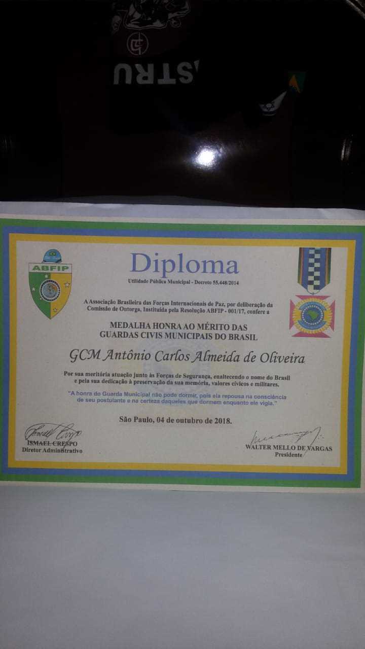 O Guarda Civil Municipal de Ibaté-SP, Antonio Carlos Almeida de Oliveira, recebeu neste dia 04 de outubro de 2018, quinta-feira, da Associação Brasileira das Forças de Paz, por deliberação da comissão de Outorga, Instituída pela Resolução ABFIP – 001/17, um Diploma e uma medalha de Honra ao mérito das Guardas Municipais do Brasil, na cidade de Osasco – SP. Homenagem essa pelo seu esforço, dedicação aos seus estudos e seus serviços prestados à sociedade.