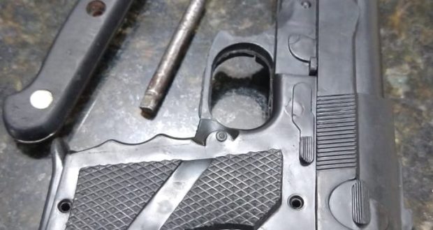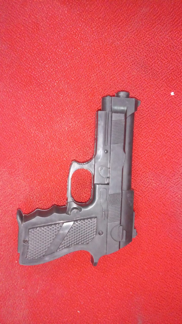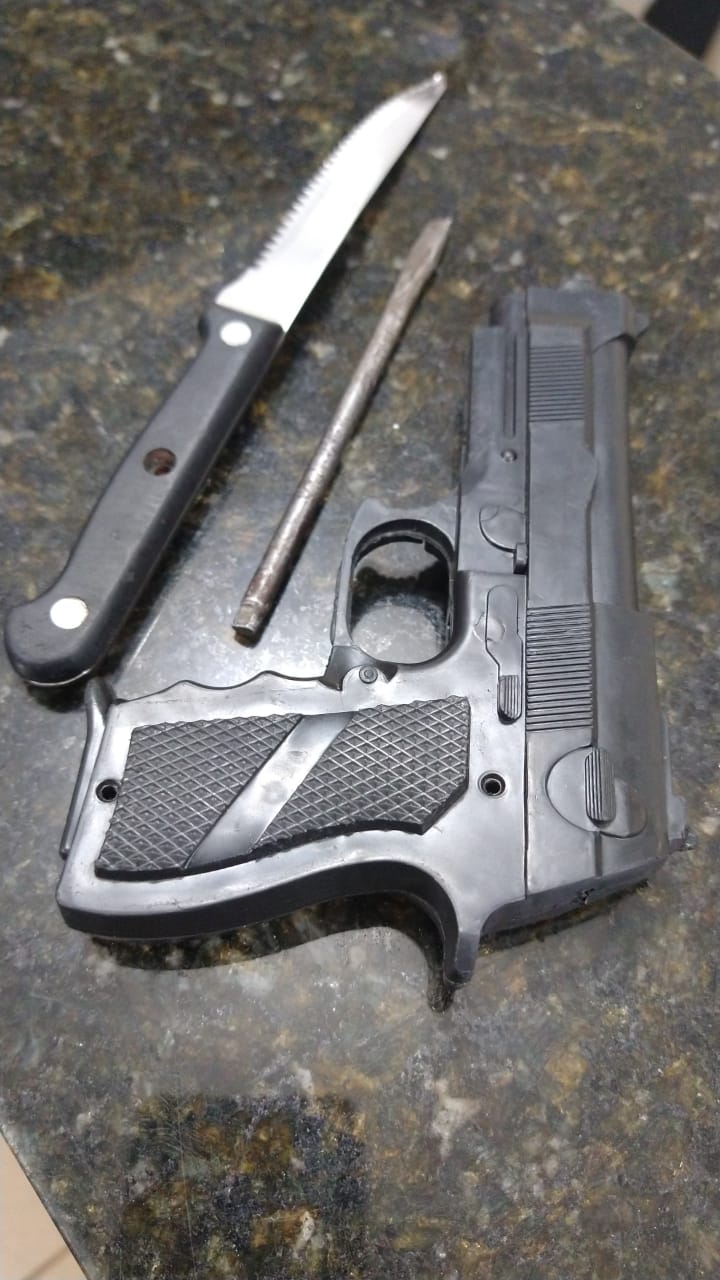 Com F.O. (25 anos) foi possível constatar pelas imagens que o mesmo guardou em sua cintura, objeto semelhante a arma de fogo, porém no momento da abordagem nada foi encontrado com ele, após buscas pelo local, a guarnição logrou êxito em localizar um simulacro de arma de fogo no jardim da igreja São Benedito.