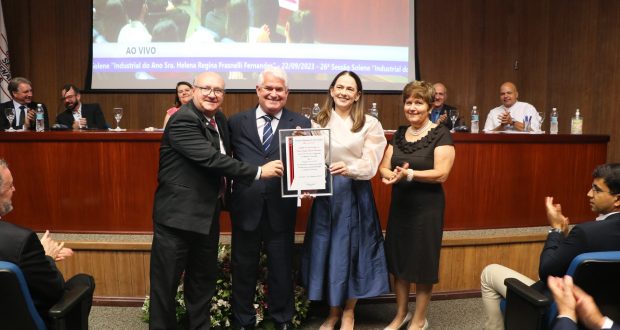 A Câmara Municipal realizou na última sexta-feira (22) uma sessão solene onde foi entregue o título de “Industrial do Ano de 2023” a Helena Regina Frasnelli Fernandes, sócia da empresa NSF Indústria e Comércio de Equipamentos para Instalações Comerciais Ltda. Eleita pelo CIESP, SESI e SENAI, recebeu a homenagem em reconhecimento à sua contribuição ao desenvolvimento do Município.