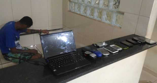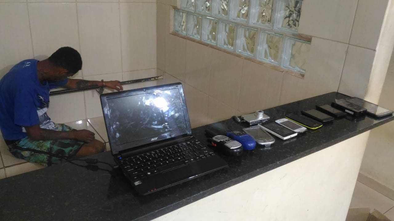 Heverton.A. F, idade não informada, foi detido e ainda de acordo com a PM, em sua guarda foi localizada cocaína, maconha e um computador (net book), este produto furto/roubo.